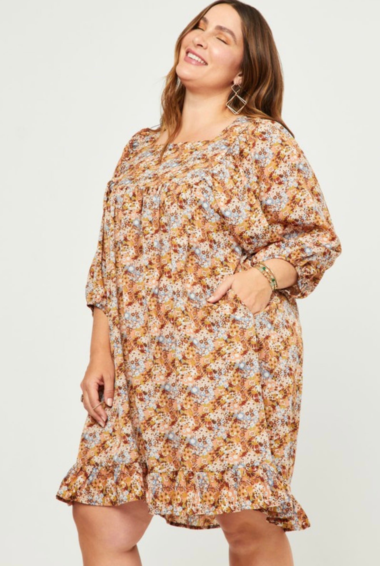 Plus Square Neck 3/4 Sleeve Floral Printed Dress